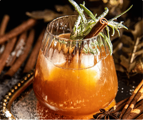 Adaugă crenguţa de rozmarin în shaker şi zdrobeşte-o uşor pentru a elibera uleiurile aromatice. Apoi toarnă în shaker toate celelalte ingrediente, adaugă gheaţă şi agită energic. Strecoară băutura într-un pahar cu gheaţă, apoi decorează cu rozmarinul, o felie de coajă de portocală şi un praf de scorțișoară.